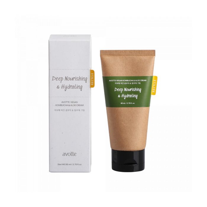 Una crema viso vegana idratante con 'Kombucha (Saccharomyces Ferment Camellia Sinensis Leaf Extract) & 'Aloe Extract' fornisce una ricca nutrizione e idratazione alla pelle secca.