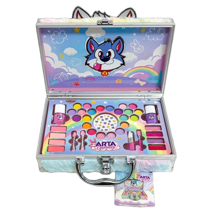 Astuccio da viaggio con make-up per bambini ispirato a MAX, la mascotte di ARTA, rifinito in peluche e con una figura di MAX sul davanti. CONTENUTO