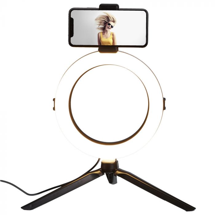 Lampada ad anello composta da un anello di 20 cm di diametro, composto da 72 LED e un treppiede.