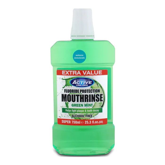 Active Oral Care Risciacquo Bucal Menta Verde di Beauty Formulas  fluoruro, un liquido che rafforza lo smalto rendendolo più resistente.