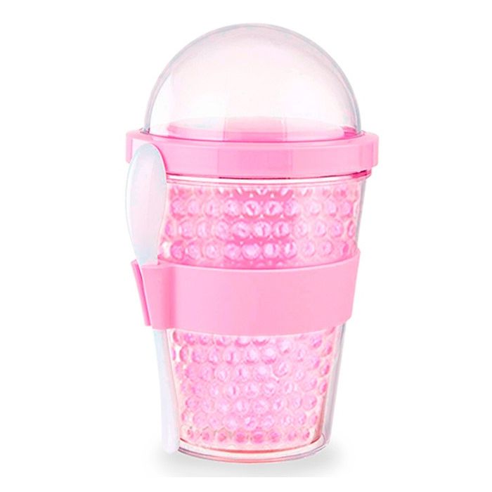 Cup 2 Go contiene una doppia parete di gel da congelare. ideale per conservare cereali, frutta, muesli, latte, yogurt o qualsiasi snack. Mantiene separati gli alimenti fino a quando non sono pronti per essere assunti, mantenendoli freschi e croccanti.