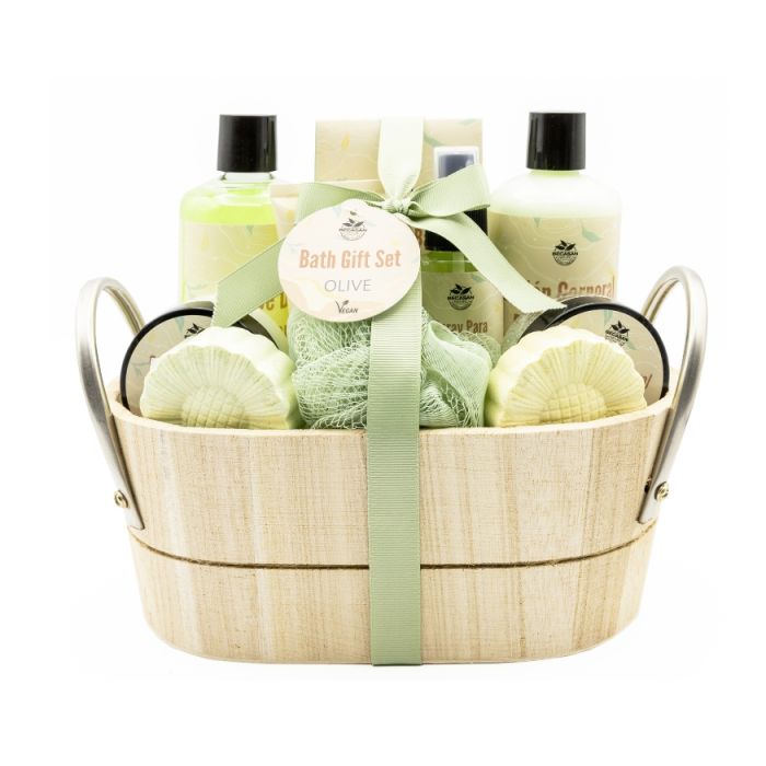 Il set da bagno Becasan Nature Olive combina benessere, eleganza e freschezza mediterranea in un unico dettaglio. Presentato in un pratico e decorativo cestino in legno con manici, può essere riutilizzato come organizer, fioriera o elemento decorativo, portando un tocco naturale e armonioso alla casa.