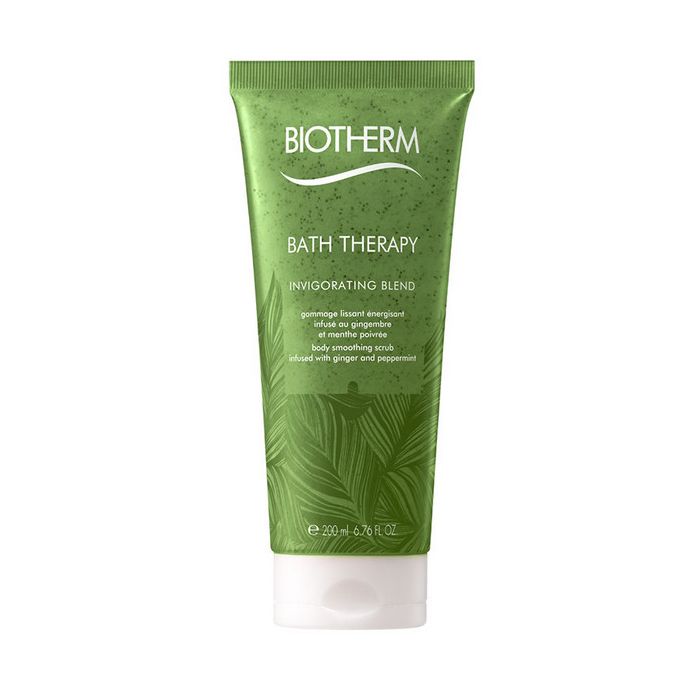 Loscrub corpo Bath Therapy Invigo di Biotherm contiene estratti di menta piperita, zenzero e gelsomino per dare energia e lasciare la pelle tonica, fresca e profumata.