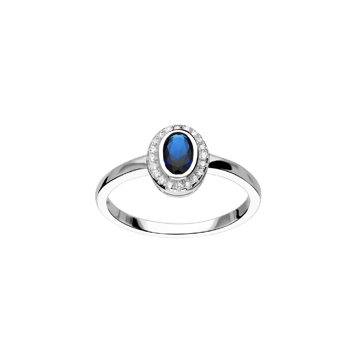 L'anello BYDAMACOCO iris , realizzato in argento sterling, presenta una gemma di zaffiro blu intenso che cattura l'essenza del cielo sereno dopo la pioggia.