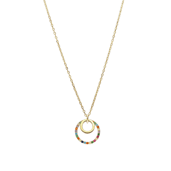 La collana Joy è realizzata in argento placcato oro 18 carati con un cerchio dai colori vivaci. Un gioiello che irradia felicità e freschezza, come una celebrazione luminosa in ogni gesto.