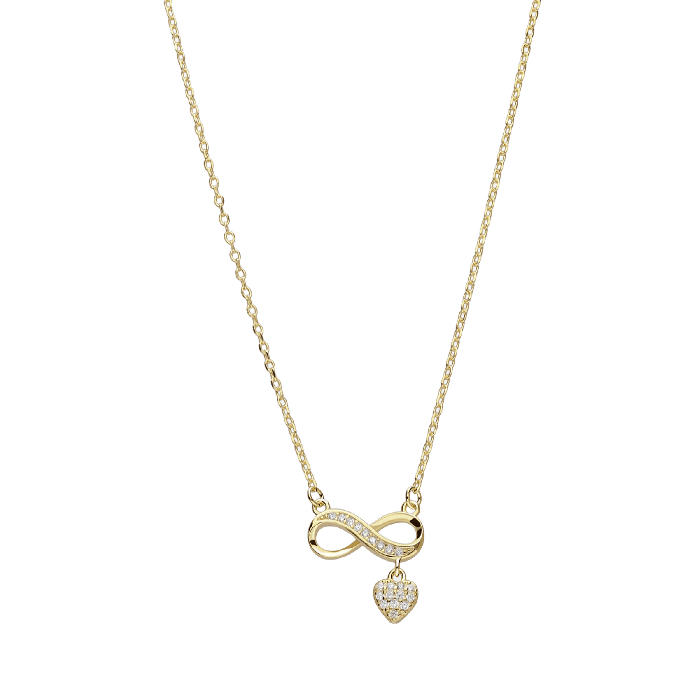 La collana Love è realizzata in argento placcato oro 18 carati con due simboli intrecciati. Un joy che racconta una storia di amor amor eterno con calore, dolcezza e lucentezza dorata.