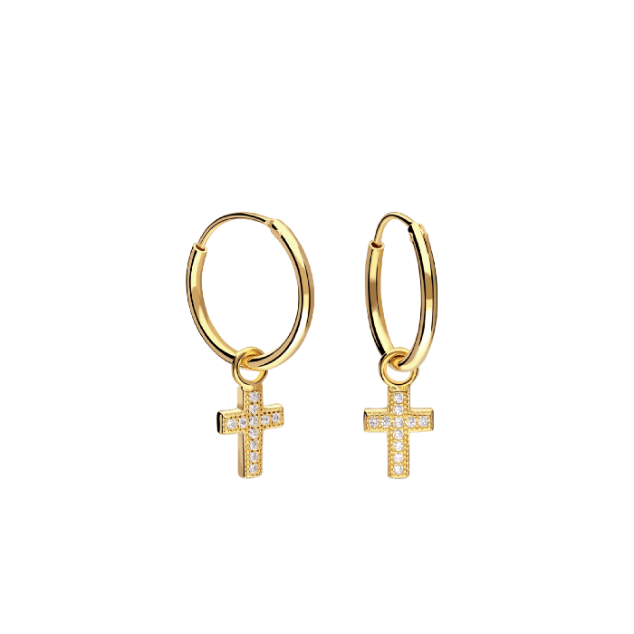 Gli orecchini aureola BYDAMACOCO sono un pezzo squisito realizzato in argento sterling placcato in oro 18 carati, con un design delicato che incorpora una croce luminosa.