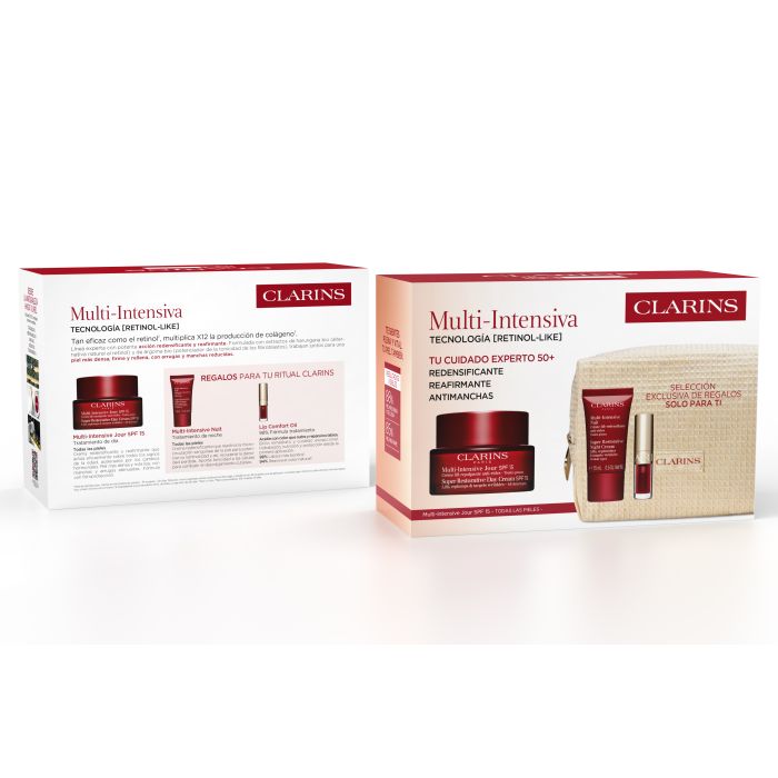 All’interno del cofanetto Multi-Intensiva Giorno troverete la Crema Multi-Intensiva Giorno SPF15 (50 ml), che fornisce idratazione quotidiana con protezione solare e contrasta la perdita di densità. Inclusa anche la Crema Multi-Intensiva Notte (15 ml), formulata per rigenerare e ridensificare la pelle durante il riposo notturno.