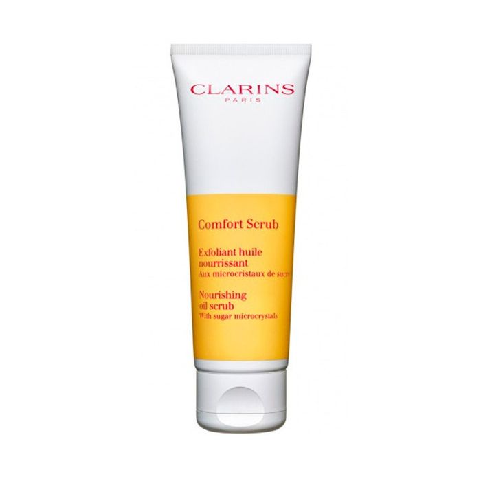 Clarins presenta Comfort Scrub Facial Exfoliator, uno scrub esfoliante all'olio con micro cristalli di zucchero che offre un trattamento nutriente per la pelle.