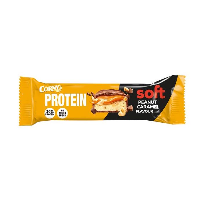 Le barrette Corny Protein Soft alle arachidi hanno una consistenza morbida, con un gustoso e generoso ripieno di caramello ricoperto da uno strato di cioccolato.