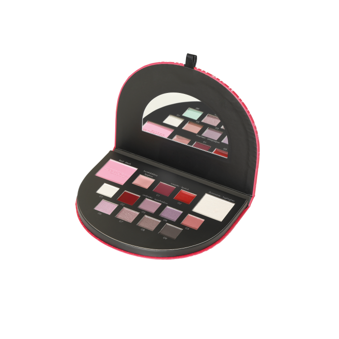 9 ombretti, 3 gloss/stick, 1 blush, 1 illuminante, 1 specchietto