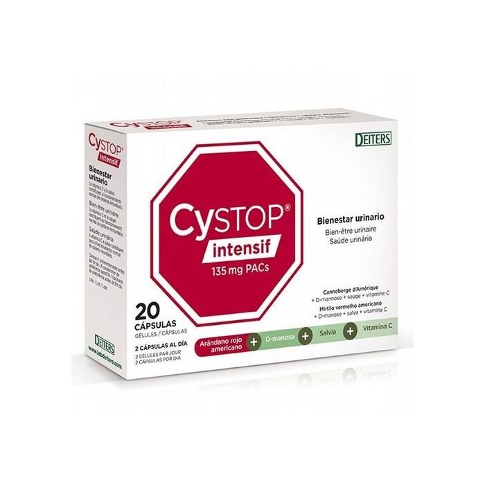 ITERS CYSTOP INTENSIF CAPSULE: Cystop® Intensif è un integratore alimentare a base di mirtillo rosso americano, D-manosa, salvia (con acido ursolico al 15%) e vitamina C, sotto forma di softgel di gelatina dura, per il benessere delle vie urinarie. La vitamina C e la salvia contribuiscono al normale funzionamento del sistema immunitario.