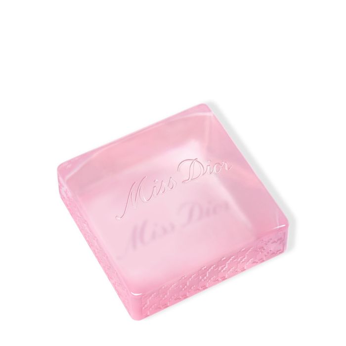 La superficie del sapone è decorata con l’iconico motivo pied-de-poule della Maison Dior, un omaggio alla fragranza Miss Dior del celebre stilista.