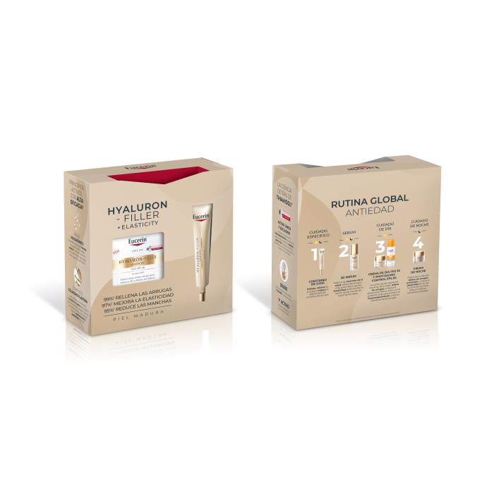 Scoprite una cura antietà completa con l'eucerin Hyaluron Filler + Elasticity Pack, progettato per ridurre visibilmente le rughe profonde, migliorare l'elasticità della pelle e combattere i segni dell'invecchiamento come macchie e occhiaie. Questo pack combina l'azione di due prodotti essenziali: