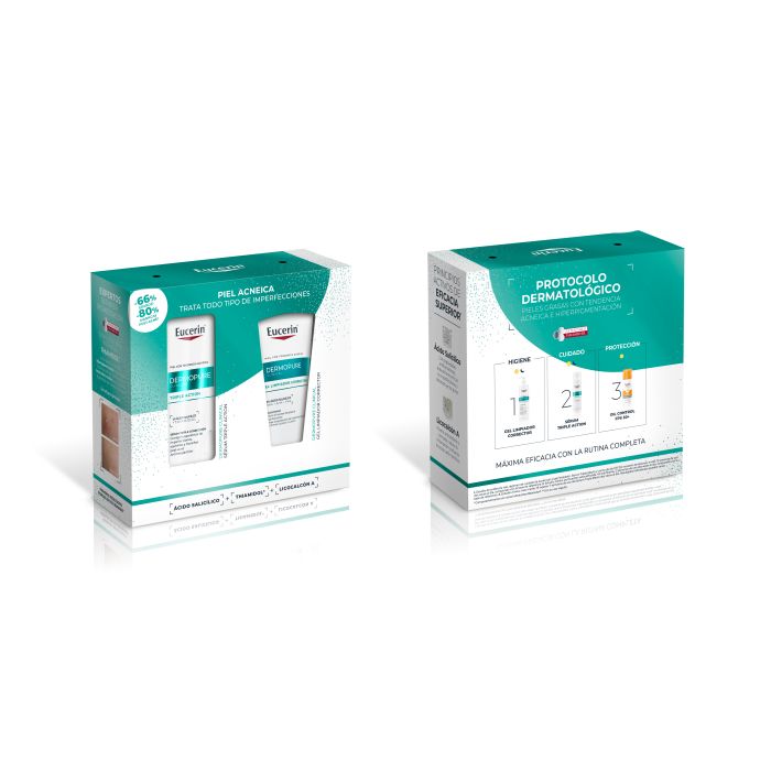 Il set clinico dermopure di Eucerin riunisce due formule dermatologicamente raccomandate che agiscono fin dal primo passo per combattere imperfezioni, macchie post-acneiche e punti neri. Include: