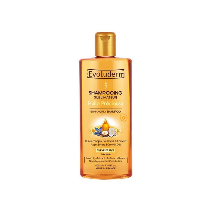 Lo shampoo Evoluderm Huile Precieuse nutre, sublima e rivela la lucentezza dei capelli, lasciandoli puliti e morbidi.