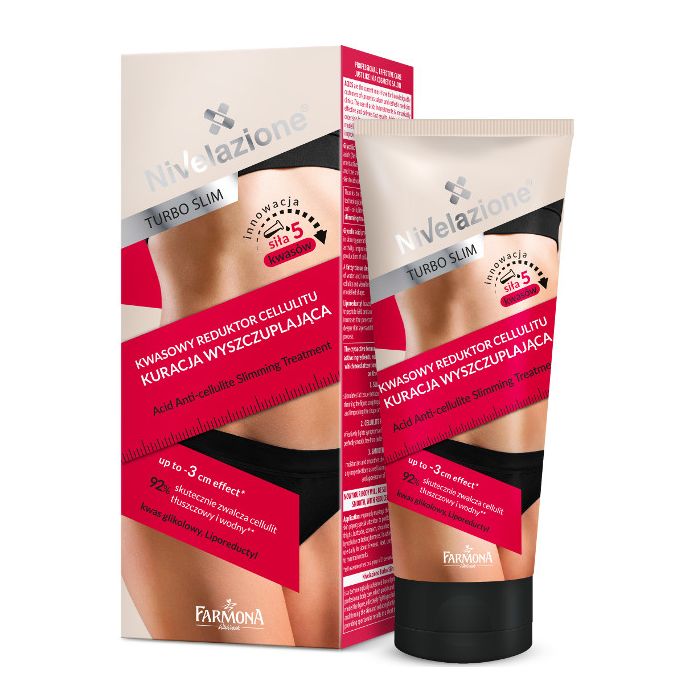 L'Acido Riduttore Cellulite Snellente Nivelazione di Farmona contiene una formula termoattiva, che contiene agenti che svolgono la loro funzione proprio nella zona problematica.