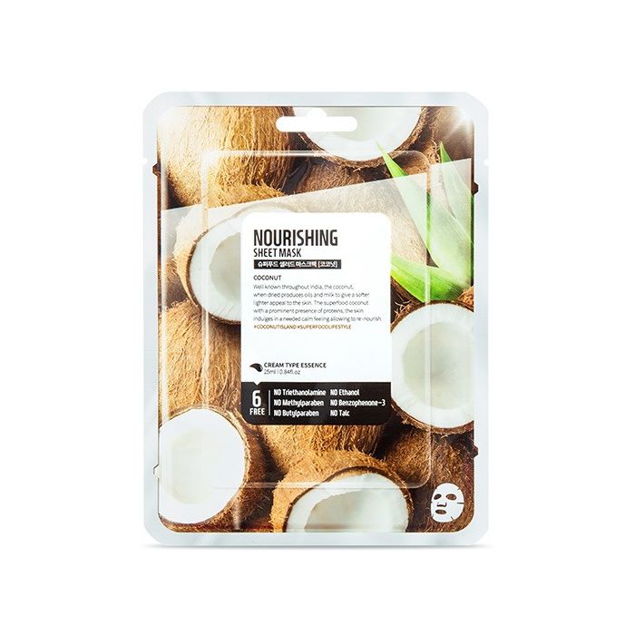 Maschera idratante al cocco Farmskin. Una maschera per il viso a forma di lenzuolo, che ti dà l’energia dell’olio di cocco e latte, per una pelle più morbida, ricca di proteine e naturale relax.
