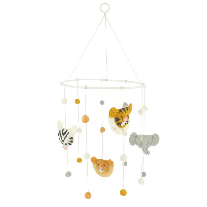 Innamorati del nostro cellulare Safari. Con pompon grigio e bianco senape e quattro mini figure (elefante, tigre, leone e zebra) in feltro.