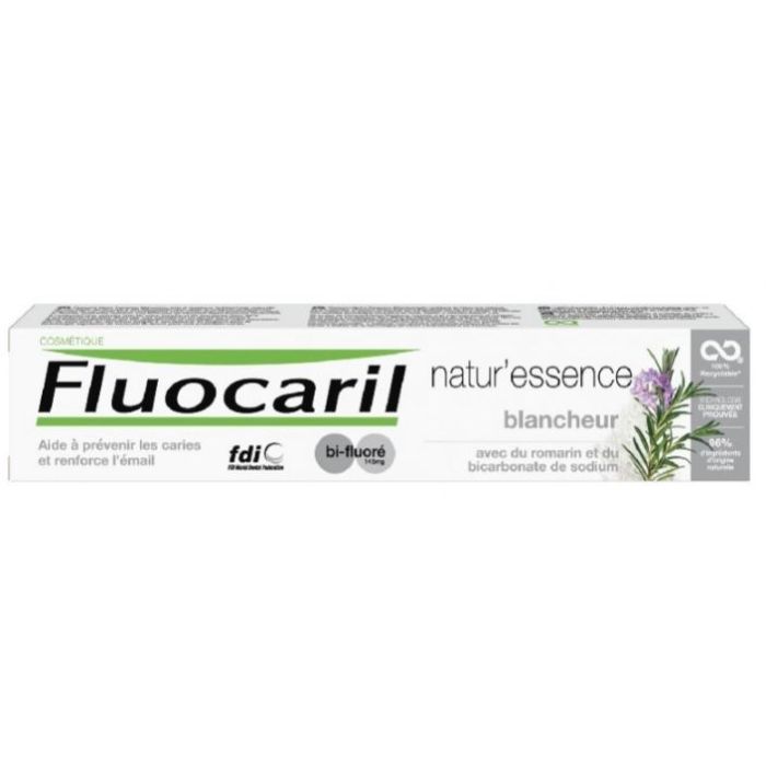 Fluocaril Natur Essence Whitening è dotato di una tecnologia bi-fluoruro con 145 mg di fluoro, olio di rosmarino e bicarbonato di sodio che aiuta a ripristinare il bianco naturale dei denti proteggendo lo smalto naturale dall'attacco degli acidi.