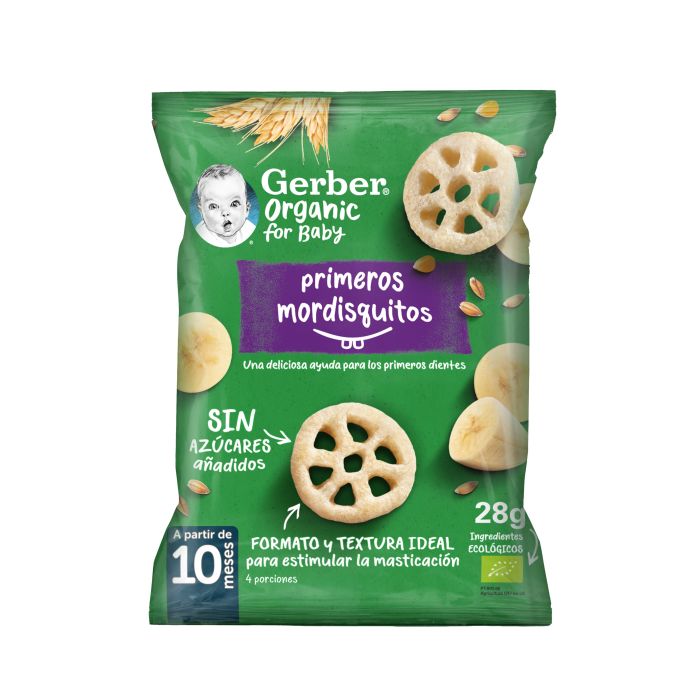 I primi bocconcini di banana di Gerber sono deliziosi snack di cereali biologici per il vostro bambino. In un comodo e sostenibile formato richiudibile. Sono cotti al forno, non fritti. Con una consistenza ideale che si scioglie in bocca. Inoltre, promuovono l'autonomia del bambino in modo divertente. Uno svezzamento baby lead sicuro.