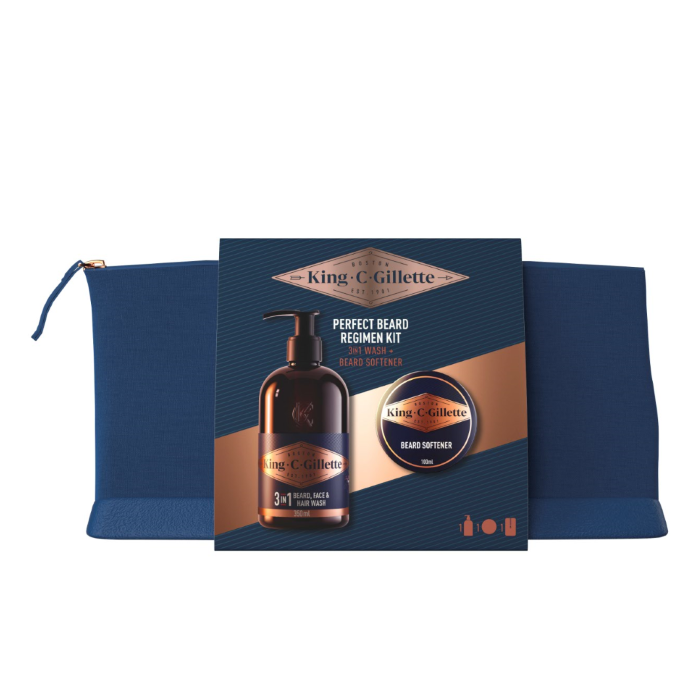 Regalate a King C. Gillette Beard Essentials Bag Set, con gel per il lavaggio della barba e del viso, balsamo e un elegante beauty-case. Lo shampoo (con acqua di cocco, olio di argan e olio di avocado) assicura una barba pulita e una pelle fresca. Il balsamo (arricchito con burro di cacao, di karité e olio di argan) assicura una barba morbida ed elastica.