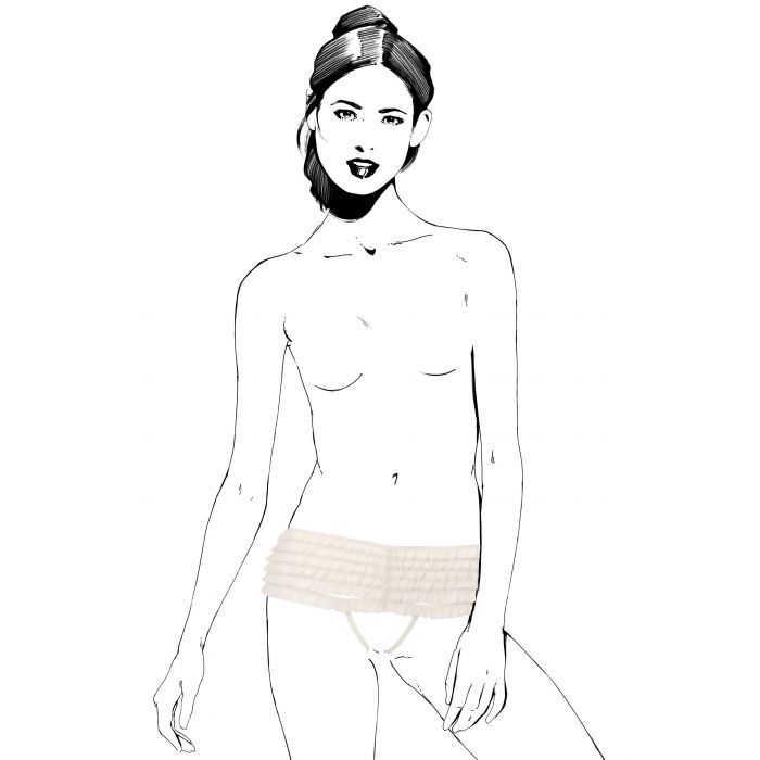 HAPPY LOLA SLIP CON VOLANT: Fai volare la tua immaginazione. La moda raggiunge il tuo corpo con tutta la sensualità del mondo. Metti in risalto il tuo fascino con lo scaldacollo a balze con dettagli speciali: grazie all’apertura strategica, il tuo pube sarà visibile.