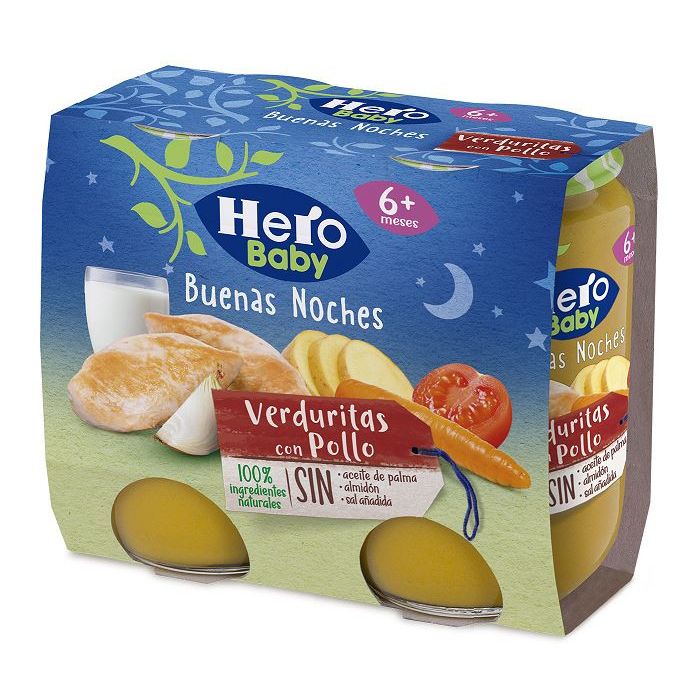 La Baby Nights Puré di Pollo con Verduritas di Hero Baby è raccomandata a partire dai 6 mesi successivi. Realizzato con prodotti naturali e sani, è caratterizzato da una consistenza morbida e da un profumo gradevole, che lo rende il cibo perfetto per aiutare il tuo bambino a riposare tutta la notte.