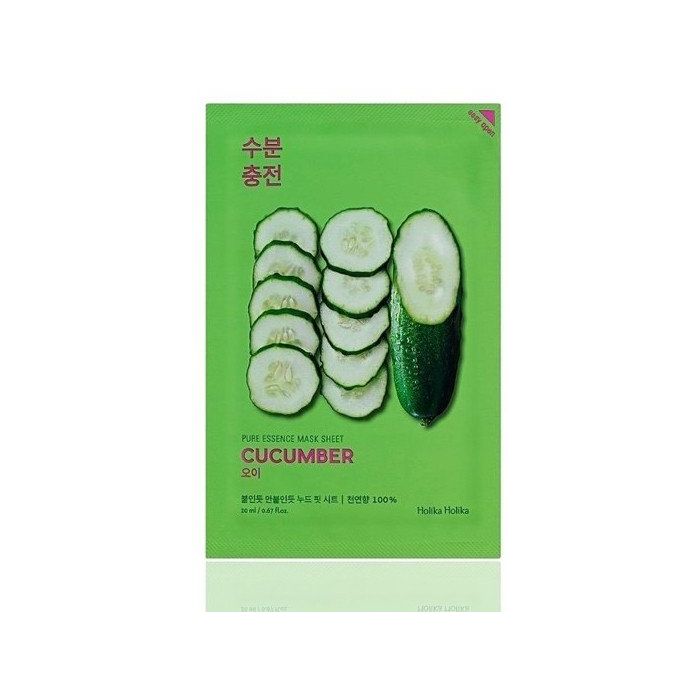 Holika Holika Pure Essence Maschera lenitiva per la pelle sensibile o irritata, arricchita con estratto di cetriolo che rinfresca, idrata, lenisce e lenisce. Aiuta a ridurre l’infiammazione, attenua le rughe e aumenta l’elasticità della pelle.