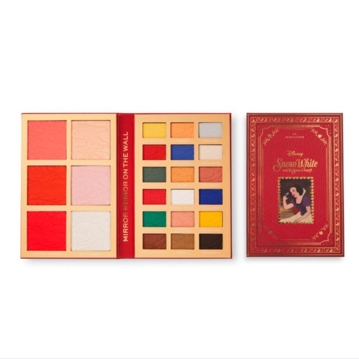 La Palette Biancaneve di I Heart Revolution e Disney Fairytale è una palette viso e occhi all-in-one ispirata ai classici libri di favole da collezione disneyani. Si apre per rivelare una pagina di ombretti opachi e scintillanti, da incantevoli ori a rossi rosati e blu accattivanti. Sull'altra pagina si trovano tre blush illuminanti matte nei colori corallo, rosa rossastro e rosa intenso, e tre blush illuminanti nei colori pesca dorato, rosa chiaro e argento scintillante.