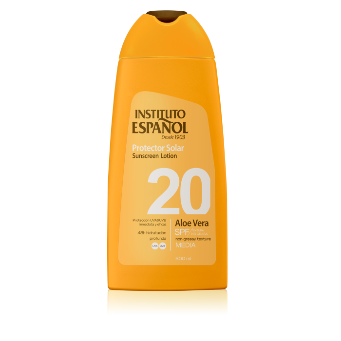 Lozione solare media 300 ml. Arricchita con aloe vera, fornisce le proprietà di cui la pelle ha bisogno quando è esposta ai raggi solari.
