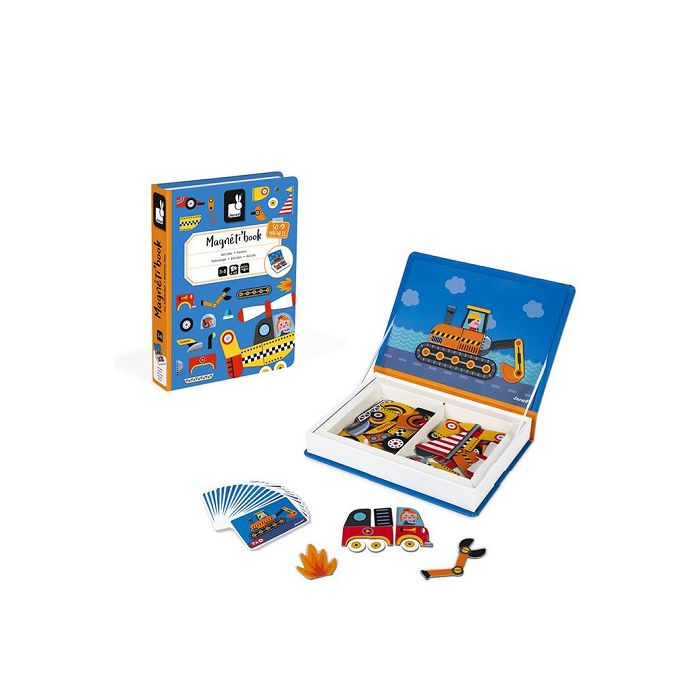 Janod  Book Bolidos è un gioco didattico magnetico in cartone con il tema dei veicoli. Composto da 50 magneti e 18 schede. Una volta aperto il libro, l'obiettivo del gioco è quello di ricostruire il veicolo nella scena che indica la carta con l'aiuto dei magneti.