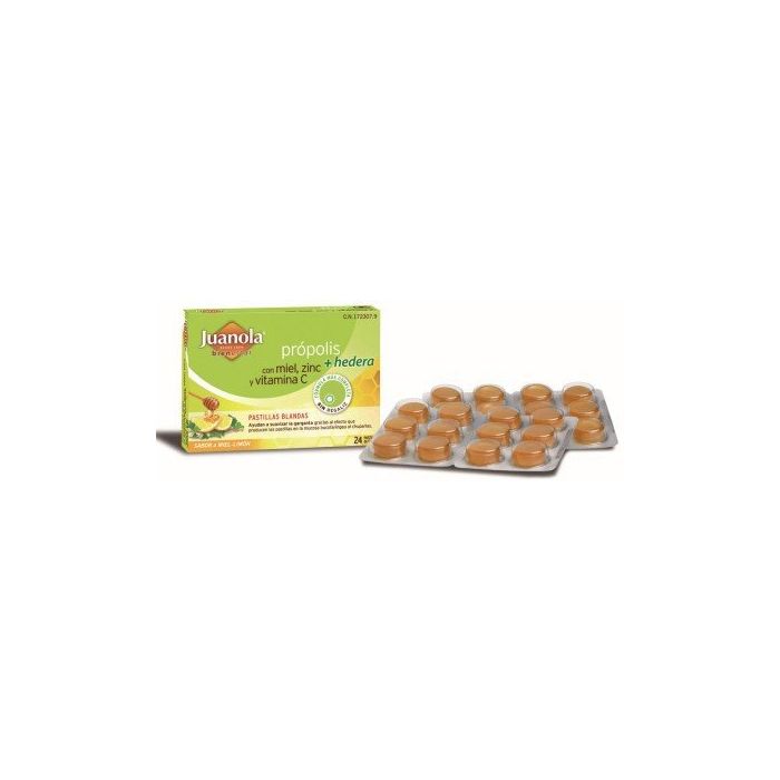 JUANOLA PROPOLIS & EDERA PILLOLE: Pastiglie per alleviare la gola di Juanola. Queste pastiglie in gomma aromatizzata al limone e al miele contengono propoli, edera (federa), miele, vitamina C e zinco, con dolcificanti. Senza zuccheri e adatto alle celiache.