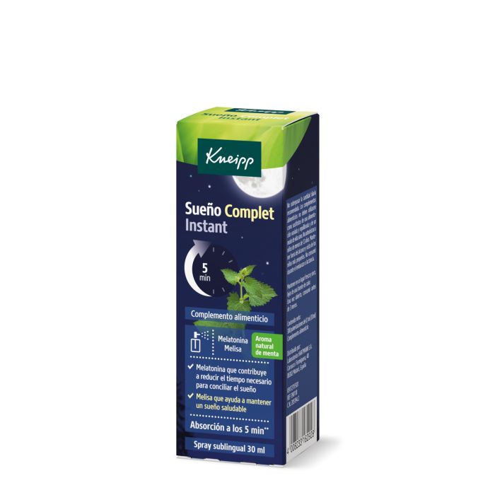 Kneipp® Sueño Complet Instant è uno spray sublinguale ad assorbimento rapido che combina Melatonina per ridurre il tempo necessario per addormentarsi, estratto di Melisa per mantenere un sonno naturale e un fresco profumo naturale di Menta.