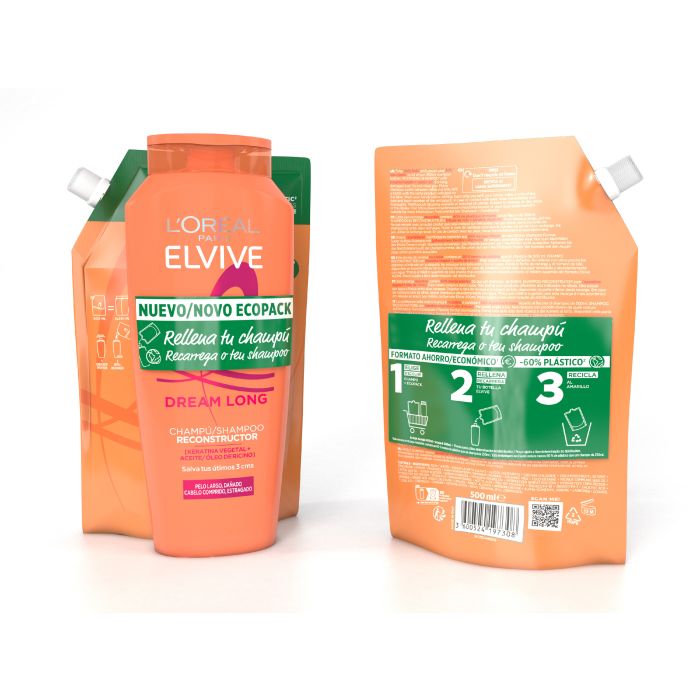 *Bottiglia precedente: ricarica riciclabile da 500 ml di Elvive Dream Long Ecopack Shampoo con il 60% di plastica in meno.