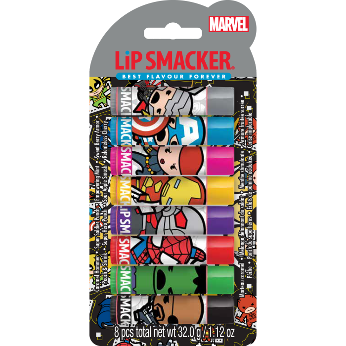 Questo set di balsami per labbra contiene Thor, Capitan America, Vedova Nera, Iron Man, Ant Man, Spider Man, Hulk e Nick Fury.