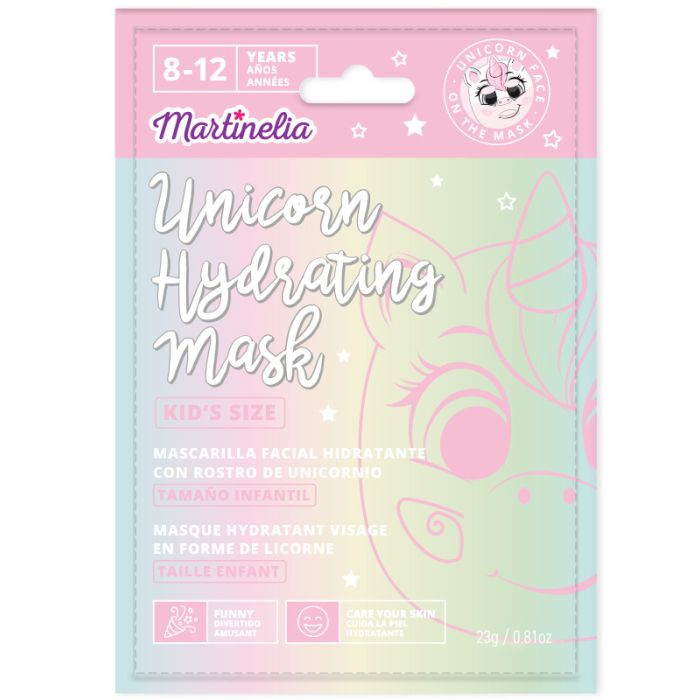 Maschera idratante per bambini con il volto di unicorno. Adatta ai bambini dagli 8 ai 12 anni.