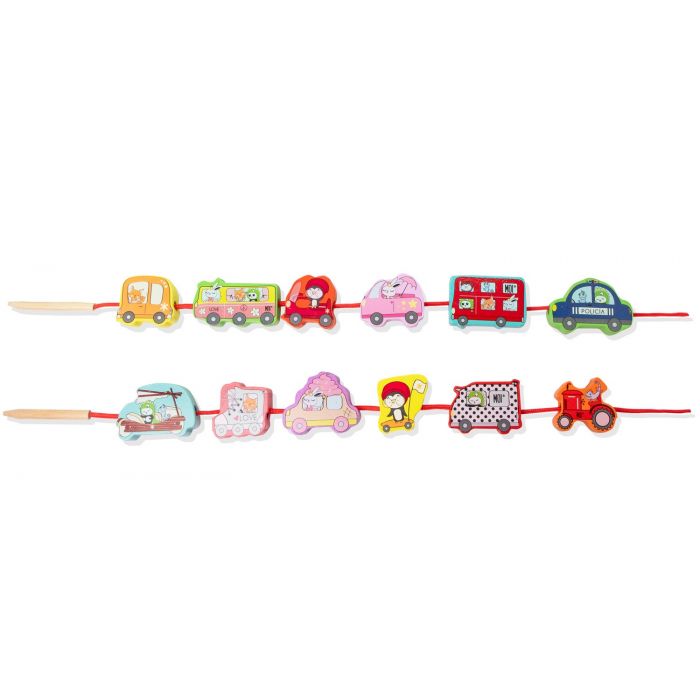 Aiuta a sviluppare le capacità motorie e le abilità dei piccoli imparando a collegare i pezzi di legno. Include 12 passeggini e un cordino con punta in legno per facilitare l'assemblaggio.