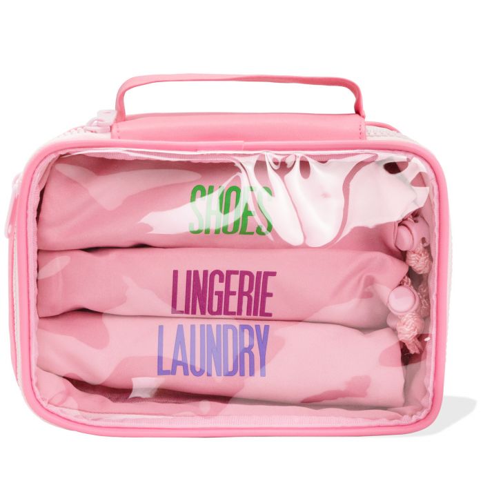 Set da viaggio MOI*: Beauty case in PU con manico, parte anteriore trasparente e chiusura con cerniera, con 3 borse organizer. Le borse sono dotate di chiusura con bottone e cordino in nylon.