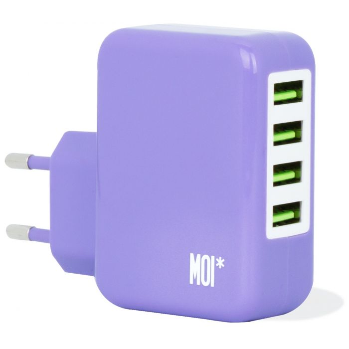 Caricabatterie USB universale a 4 porte con spina europea. Consente di caricare contemporaneamente diversi dispositivi.
