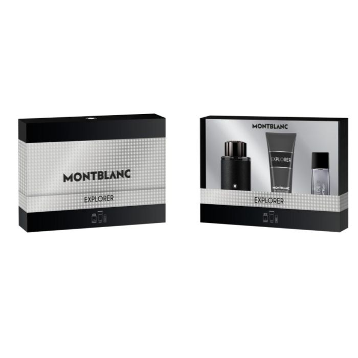 Cofanetto Explorer Eau de Parfum: Un elegante cofanetto con il profumo Explorer di Mont Blanc e altri prodotti della stessa fragranza.