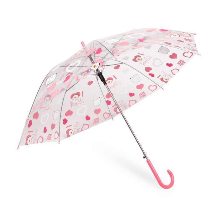 Ombrello trasparente con sistema di apertura manuale e impugnatura ergonomica rosa.
