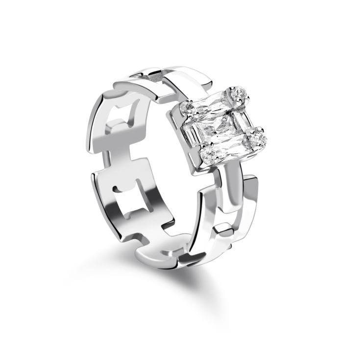 Anello Nessari Alaska in argento sterling composto da un'abbagliante pietra baguette, posta al centro di una struttura di maglie quadrate.