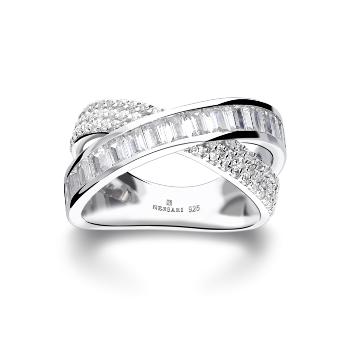 Design Nessari composto da un'abbagliante struttura incrociata di pietre baguette e da un prezioso pavé di zirconi.