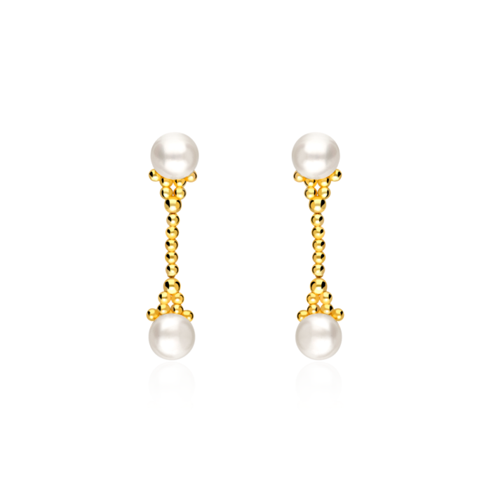 Posizionate strategicamente per esaltare la bellezza naturale di chi le indossa, le perle emanano una purezza e un'eleganza che trasformano qualsiasi abito in una dichiarazione di raffinatezza. Il collegamento tra le perle e la fila di perline dorate aggiunge un tocco di modernità e lusso, rendendo gli "Orecchini Safis" l'accessorio perfetto per ogni occasione.