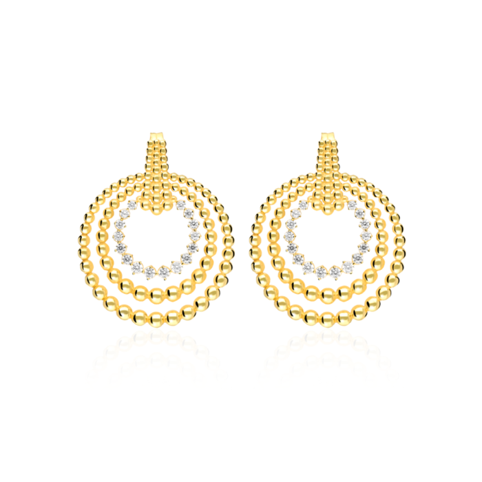Impreziosite il vostro look Nessari con gli splendidi "Orecchini Sokaris". Realizzati in argento sterling con placcatura in oro 18 carati, questi orecchini sono un vero gioiello di raffinatezza. Il loro design spettacolare comprende due file circolari esterne di perline placcate in oro e una fila interna di zirconi scintillanti, creando un pezzo che cattura l'essenza del lusso e dell'eleganza.