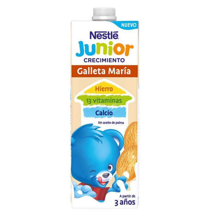 Latte Junior Crescita Galletta Maria di Nestlé fornirà ai più piccoli in casa tutte le sostanze nutritive di cui hanno bisogno in modo equilibrato, in quanto contiene ferro, magnesio, calcio, carboidrati, iodio e 13 vitamine. È realizzato con latte vaccino raccolto ogni giorno dalle valli della Spagna settentrionale.