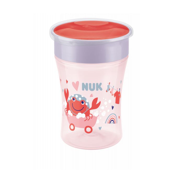 Nuk Mini Magic Cup +8m è un bicchiere “magico” a prova di fuoriuscita grazie a un disco in silicone che garantisce una perfetta tenuta. Ha maniglie ergonomiche, un coperchio trasparente per la massima protezione e igiene e un bordo a 360° per un drink confortevole.