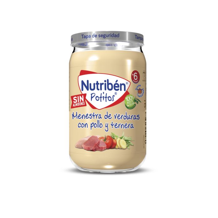 Potito Guiso di Pollo e Manzo con Fagiolini Nutribén, creato per nutrire il tuo bambino dopo sei mesi, aiutandolo a seguire una dieta varia. Basato su una ricetta tradizionale a base di ingredienti freschi. Con pollo, manzo, pomodoro, patate, fagiolini, riso e olio extravergine di oliva 100%. Perfetto per introdurre alimenti solidi nella dieta.