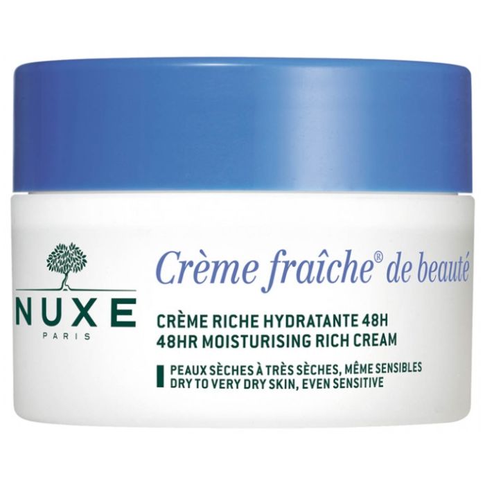 NUXE Rich Moisturizing Cream 48h, con latti vegetali ed estratto di alghe, fornisce 48 ore di idratazione, calma e protegge la pelle dall'inquinamento.